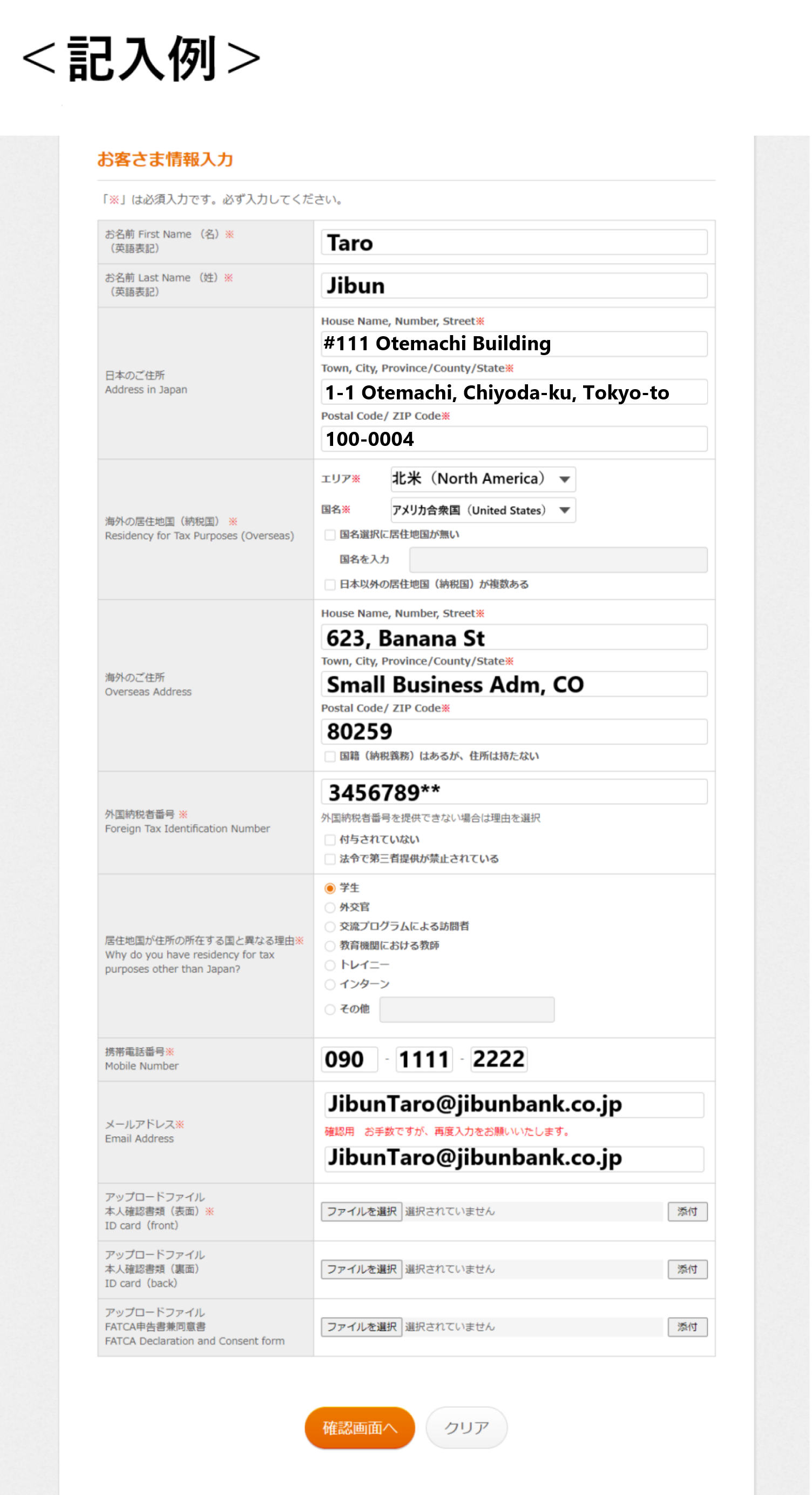 米国の納税義務者に該当する場合は以下のFATCA申告書兼同意書に必要事項をご記入のうえ、「特定取引を⾏う者の任意届出兼異動届出フォーム」からアップロードをお願いいたします。