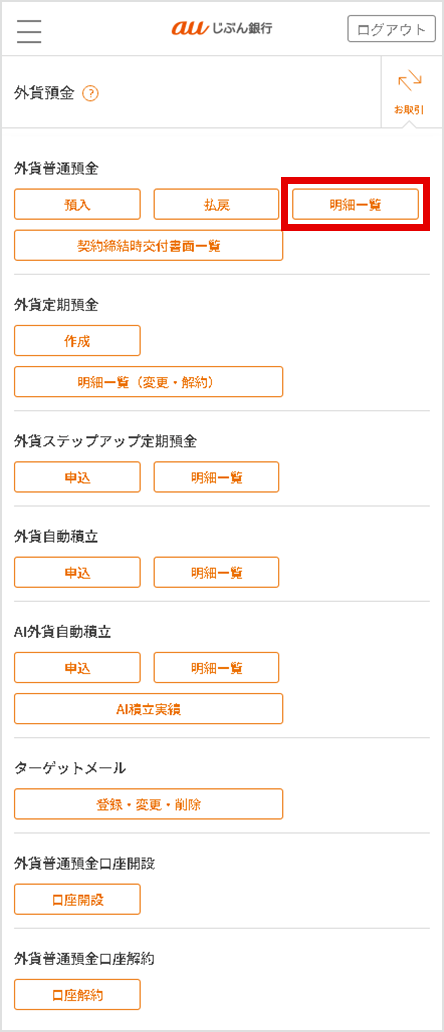スマートフォン、パソコンからログインのうえ、メニューの「外貨預金」→「外貨普通預金」の[明細一覧]よりご確認ください。