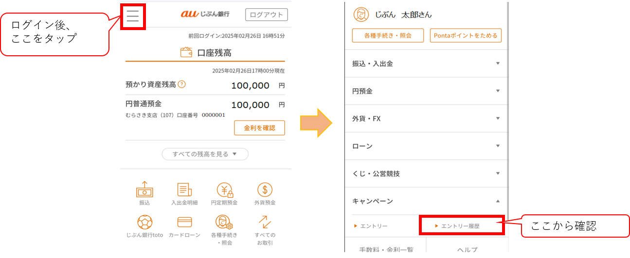 インターネットバンキングログイン→「キャンペーン」→「エントリー履歴」→「エントリー内容確認」