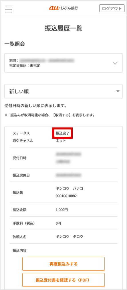 なお、auじぶん銀行での処理状況は、ログイン後画面の[振込]→「履歴一覧」にてご確認いただけます。