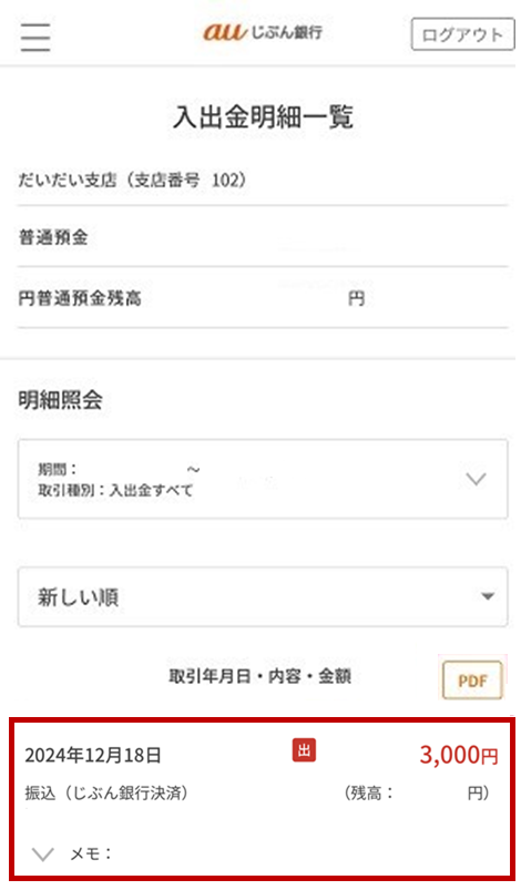 じぶん銀行アプリ・インターネットバンキングの[入出金明細]でご確認ください。